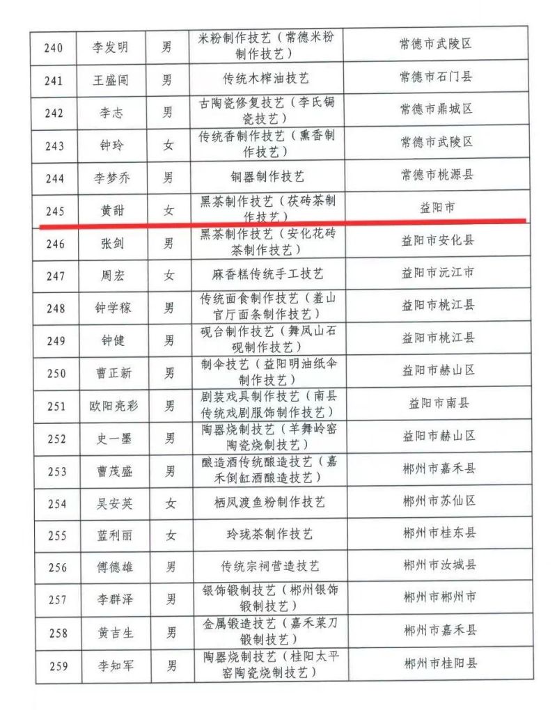 為深入學(xué)習(xí)貫徹習(xí)近平文化思想,加強(qiáng)非物質(zhì)文化遺產(chǎn)傳承人隊(duì)伍建設(shè),有效保護(hù)和傳承省級非物質(zhì)文化遺產(chǎn)代表性項(xiàng)目,根據(jù)《中華人民共和國非物質(zhì)文化遺產(chǎn)法》《湖南省實(shí)施<中華人民共和國非物質(zhì)文化遺產(chǎn)法>辦法》,參照《國家級非物質(zhì)文化遺產(chǎn)代表性傳承人認(rèn)定與管理辦法》要求,經(jīng)各地申報(bào)、專家評審、現(xiàn)場答辯、評審委員會審議、社會公示等程序,省文化和旅游廳確定了第五批省級非物質(zhì)文化遺產(chǎn)項(xiàng)目代表性傳承人名單(326人),其中集團(tuán)益陽茶廠(以下簡稱益陽茶廠)黃甜榮獲第五批省級非物質(zhì)文化遺產(chǎn)項(xiàng)目黑茶制作技藝(茯磚茶制作技藝)傳承人稱號。