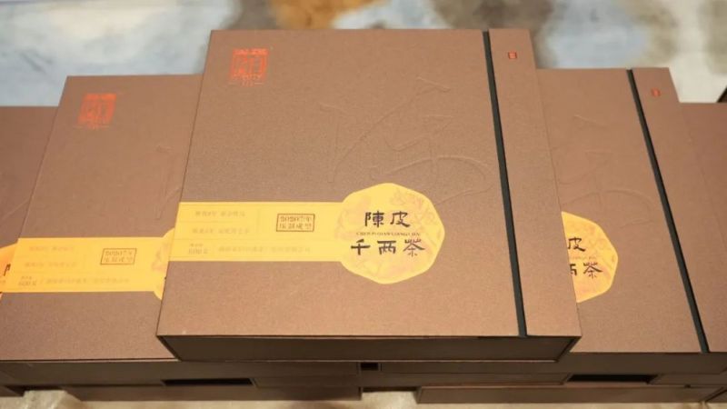 另一款新品“陳皮千兩餅”則是繼“陳皮茯茶”后又一陳皮與黑茶結(jié)合的產(chǎn)品。該產(chǎn)品采用8年陳放的傳統(tǒng)生曬的老陳皮與陳倉(cāng)五年優(yōu)質(zhì)黑毛茶為原料,按照千兩茶傳統(tǒng)制作技藝踩制成型,自然晾置干燥,在藏茶倉(cāng)庫(kù)內(nèi)自然陳放醇化3年后,分割成茶餅,再鋸成方格網(wǎng)狀,方便取茶泡飲。茶餅壓制緊密,陳皮塊分布均勻,茶香純正,果香濃郁持久,茶湯橙紅明亮,陳皮香與茶湯融合度高,滋味醇厚。