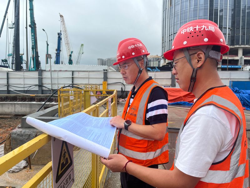 2024年4月26日,深圳市五一勞動(dòng)獎(jiǎng)?wù)芦@得者、中鐵十九局軌道公司項(xiàng)目副經(jīng)理夏荔(左)在穗莞深城際鐵路前皇段皇崗口岸站建設(shè)現(xiàn)場(chǎng)忙碌。新華社發(fā)