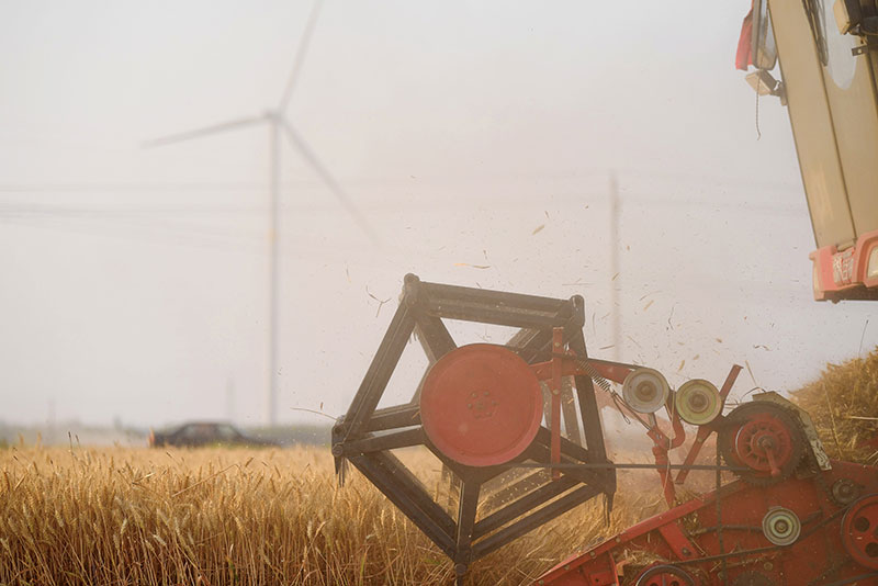 在河南省安陽(yáng)市湯陰縣菜園鎮(zhèn)高標(biāo)準(zhǔn)農(nóng)田示范區(qū),收割機(jī)在麥田作業(yè)(2022年6月8日攝)。新華社記者 郝源 攝
